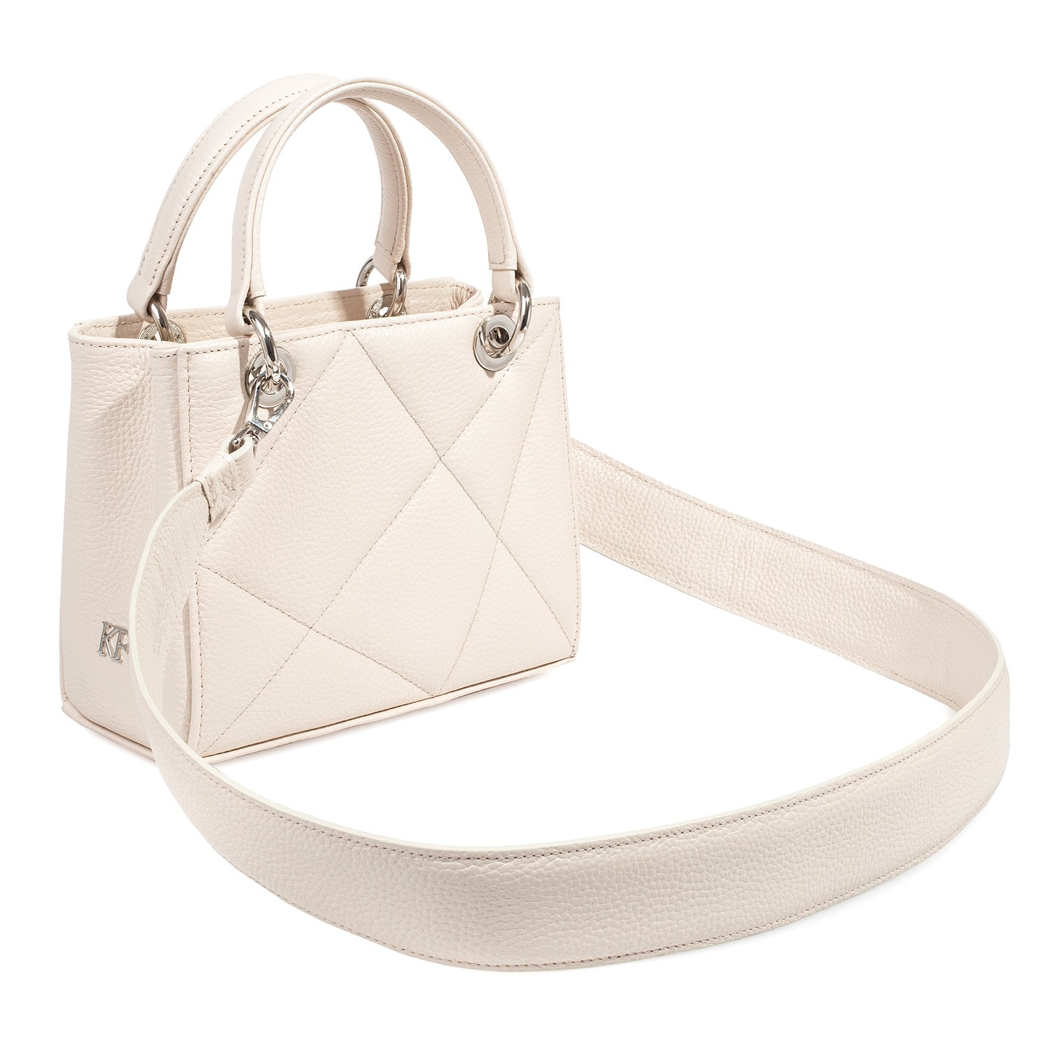 Beige (nude) genuine leather handbag from ukrainian designer Katerina Fox. This model is designed for women who appreciate the sleek design combined with functionality and comfort. High-quality and reliable hardware ensure long service bags. The internal space of a bag is equipped with one spacious compartment and two patch-pockets and one zipper pocket. The bag is closed with a clasp. The bottom of the bag is protected with metal legs. There is a long handle that allows you to wear the bag on the shoulder. The kit also includes a storage bag.